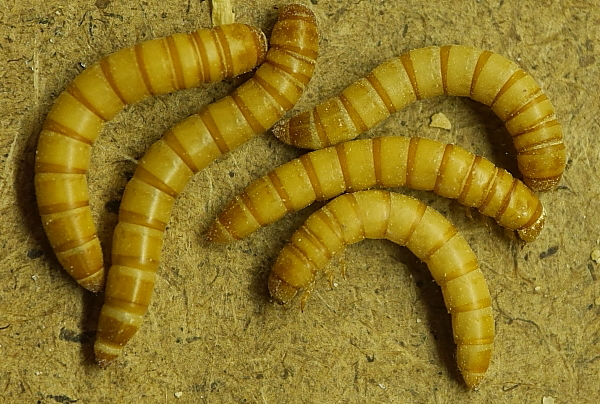 Kostengünstig und fast in jedem Zooladen käuflich, Mehlkäferlarven.