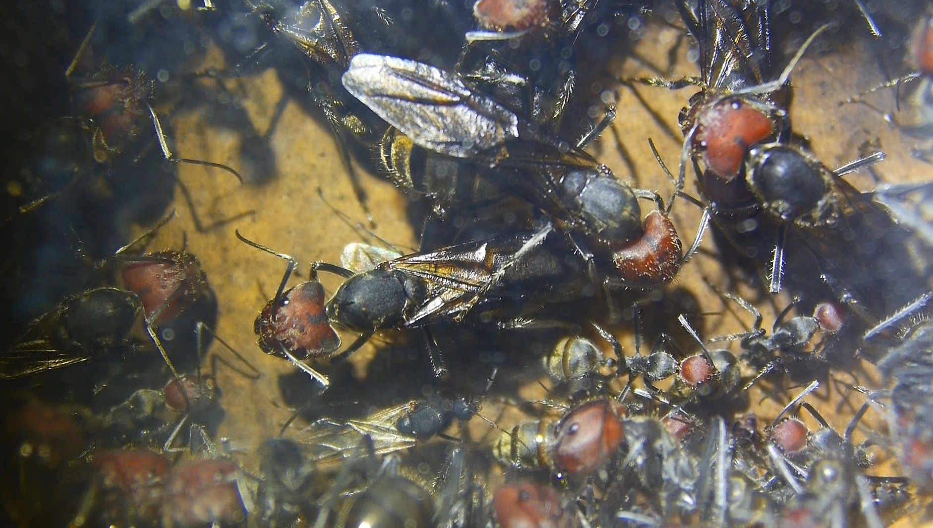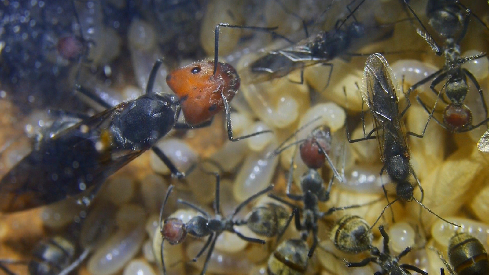 Etliche Arbeiterinnen knäulten sich zusammen und immer wieder sichtbar, Arbeiterinnen mit Eiern in den ihren Mandibeln (Mundwerkzeugen).