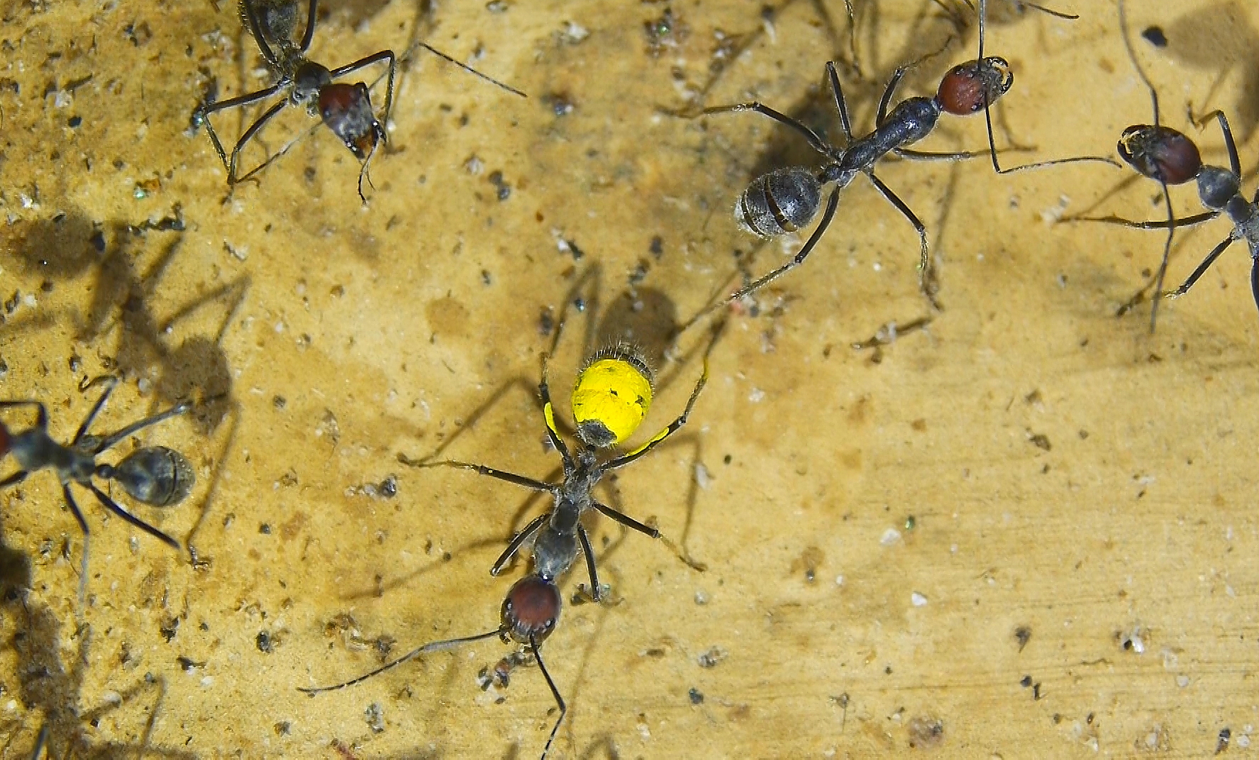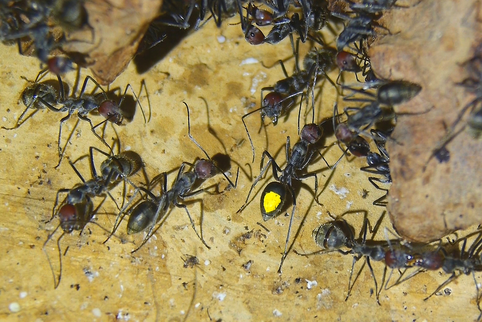 Ist jetzt nicht neu, interessant allemal, Ameisen farblich zu kennzeichnen, wie im Beitrag vorab schon angemerkt oder hier diese unbegattete, flügellose Jungkönigin.
