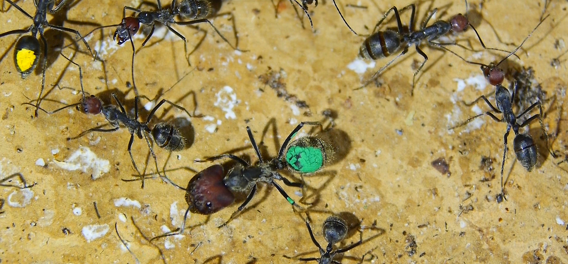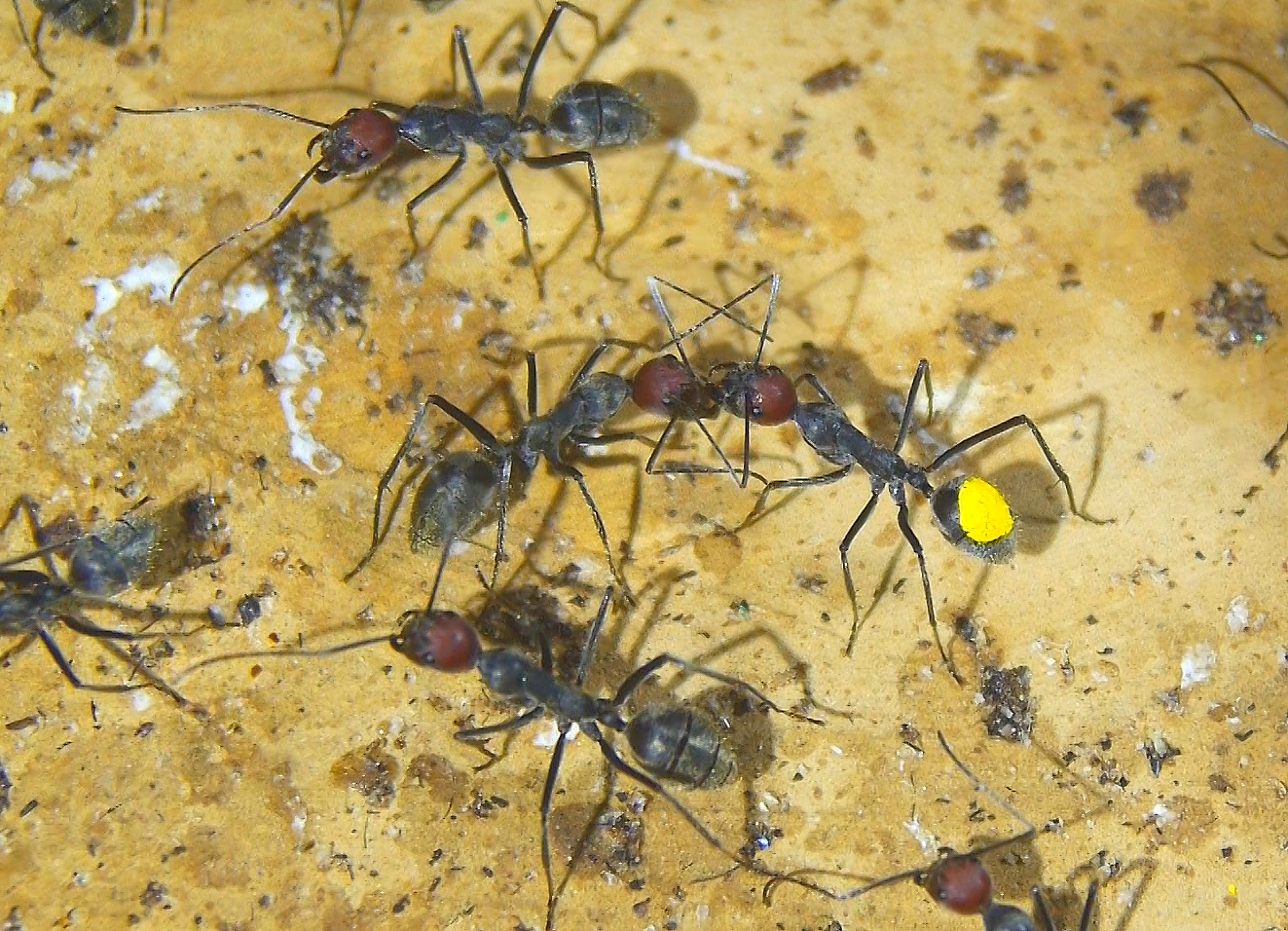 Interessant ist die durch Farbe mögliche Beobachtung von Arbeiterinnen, wie sie sich in der Arena verhalten.