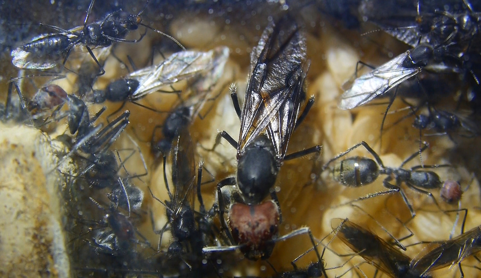 Ältere, flügellose Jungkönigin (geschlüpft letztes Jahr) und geflügelte aus dem Schlupf dieses Jahres, gemeinsam unterwegs in der Arena.