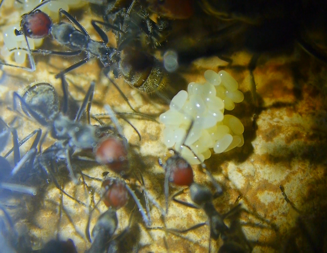 Etliche Arbeiterinnen knäulten sich zusammen und immer wieder sichtbar, Arbeiterinnen mit Eiern in den ihren Mandibeln (Mundwerkzeugen).