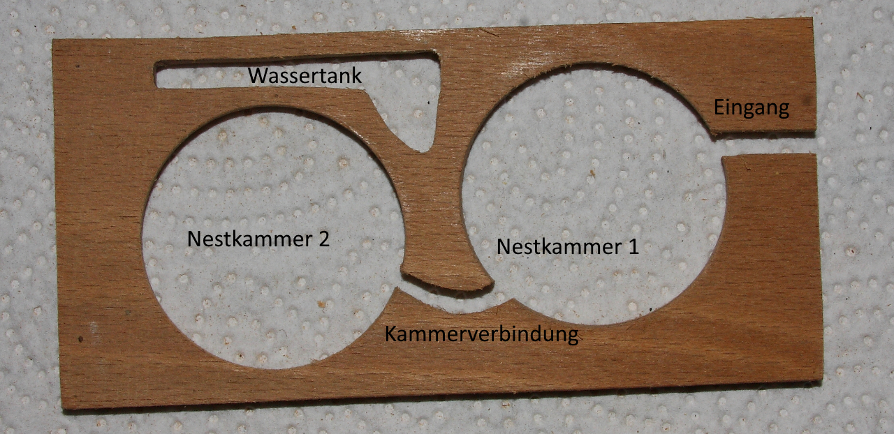 Je nach Ameisenart (Größe der Ameisen) ist unterschiedlich dickes Holz zu verwenden, z. B. bei Camponotus ligniperda kann die durchaus 2 cm betragen.