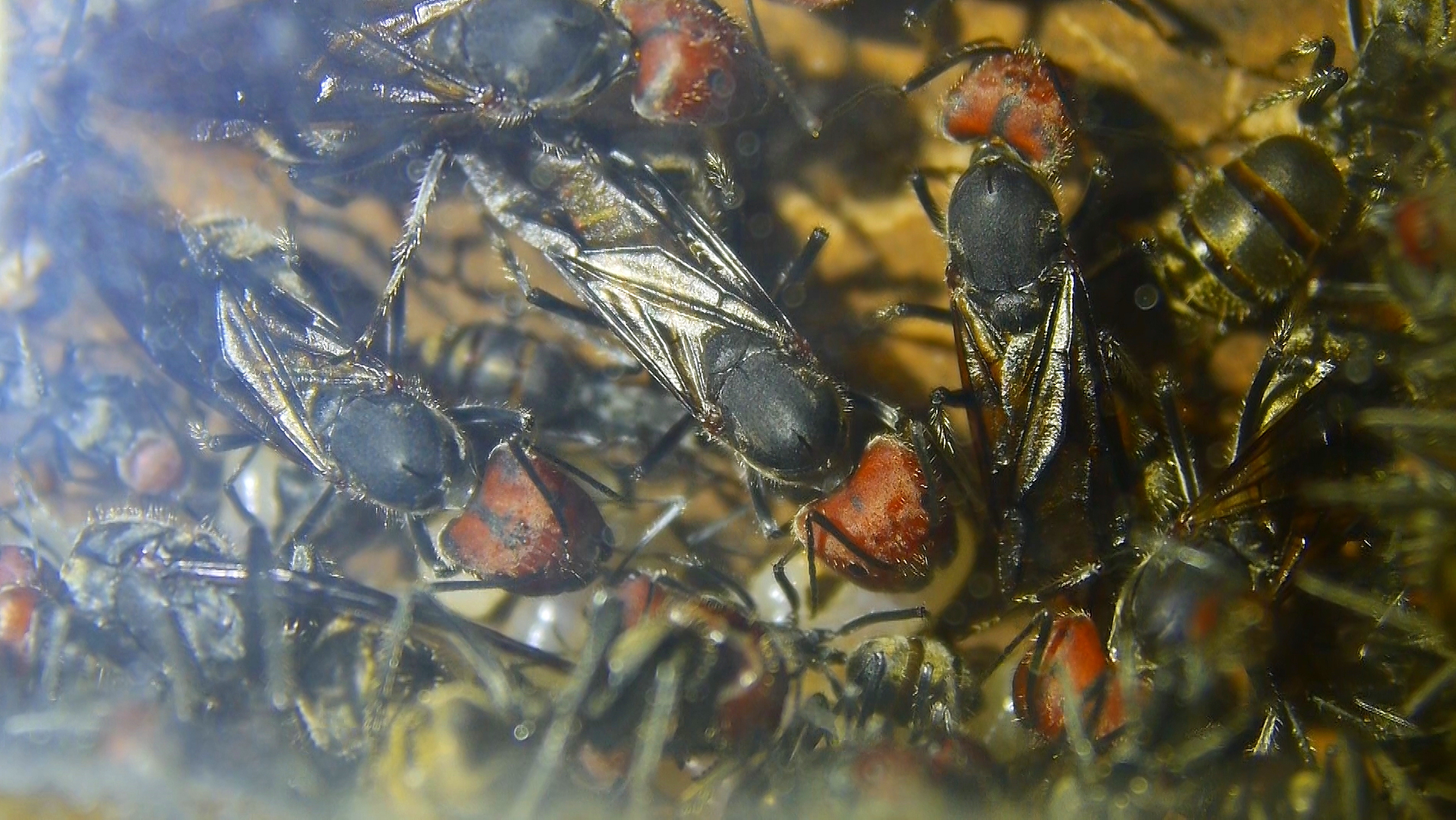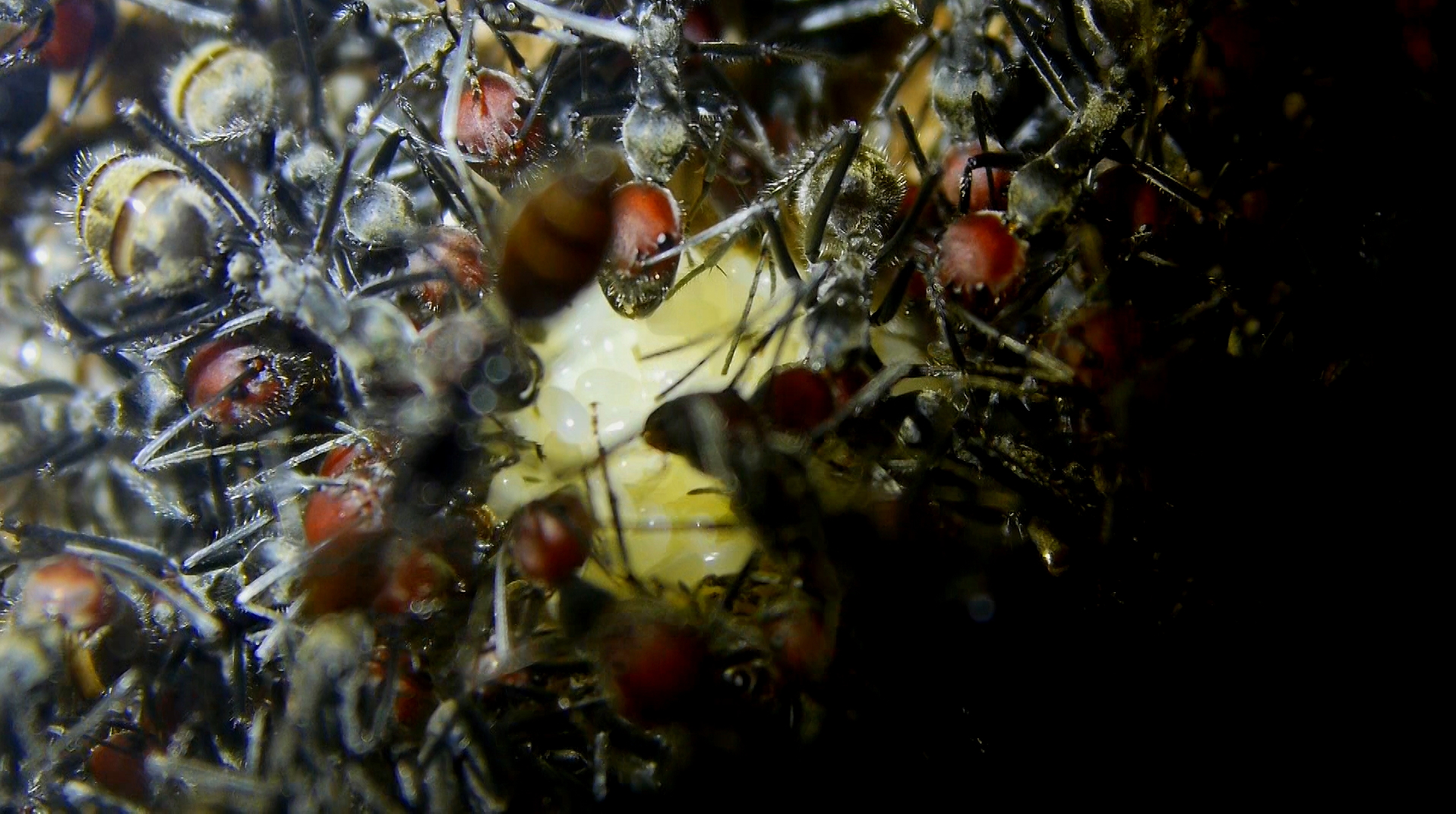 Etliche Arbeiterinnen knäulten sich zusammen und immer wieder sichtbar, Arbeiterinnen mit Eiern in den ihren Mandibeln (Mundwerkzeugen).