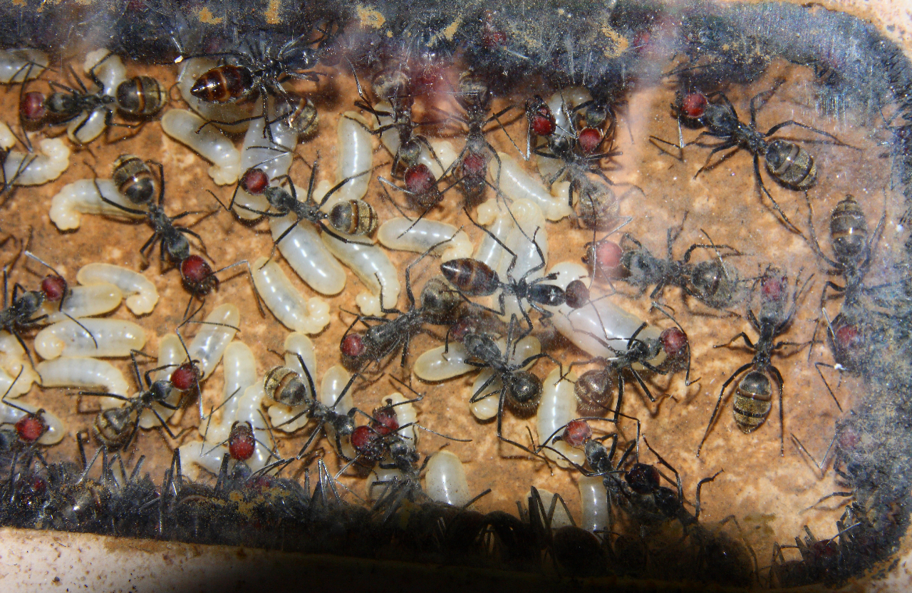 Will jetzt nicht schreiben, so langsam wird es bedenklich, merkwürdig ist es alle mal.Componotus singularis sind Kannibalen.Täglich schlüpfen neue Männchen, na ja so lange die Arbeiterinnen Männchen schlüpfen lassen.So wie hier, wo sie gerade dabei sind einem Männchen aus der Puppenhaut zu helfen.Youtube-VideoNachdem die ersten Larven sich in etwa mit gleicher Größe verpuppt hatten, was die Folgerung aufkommen lässt,es werden so viele Männchen schlüpfen wie noch nie.Geht es nach der Puppenanzahl, könnten es locker mehr als Dreihundert werden.Wie geschrieben, wenn sie diese schlüpfen lassen.Die Ameisen ziehen jetzt auch größere Larven auf, die sich zu Arbeiterinnen entwickeln dürften.