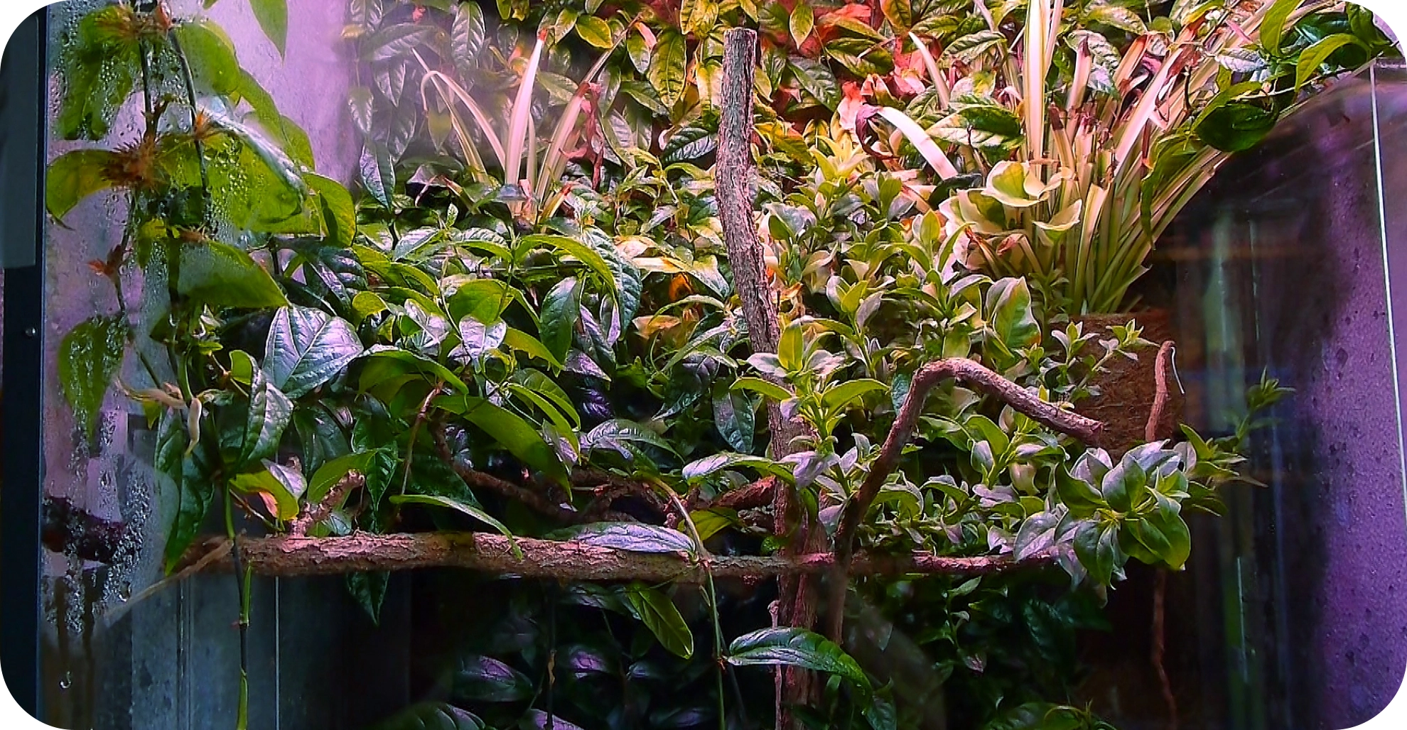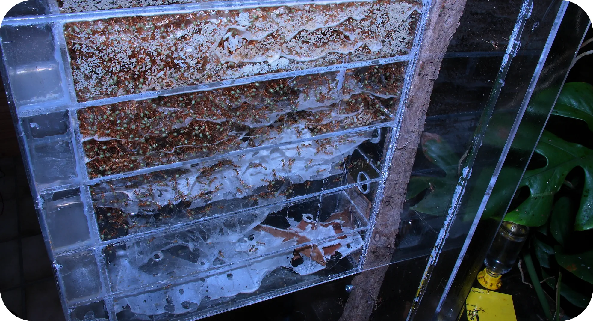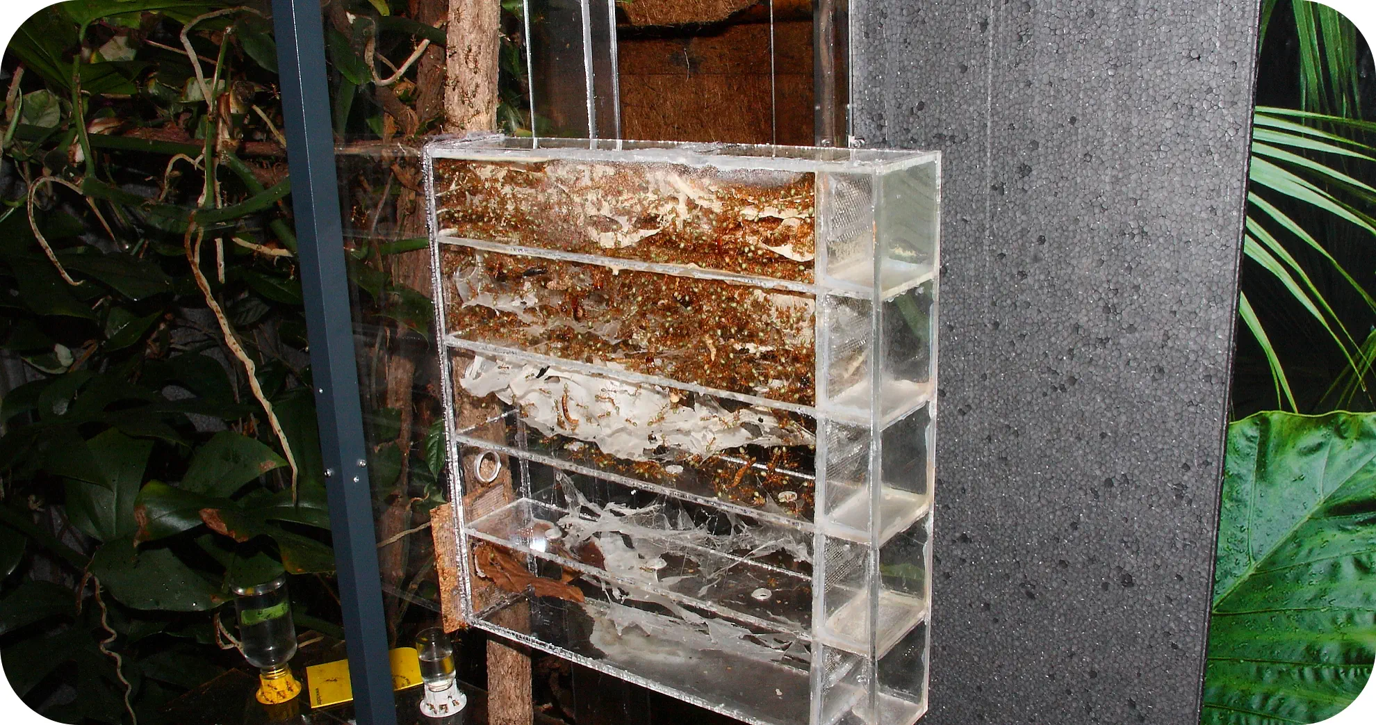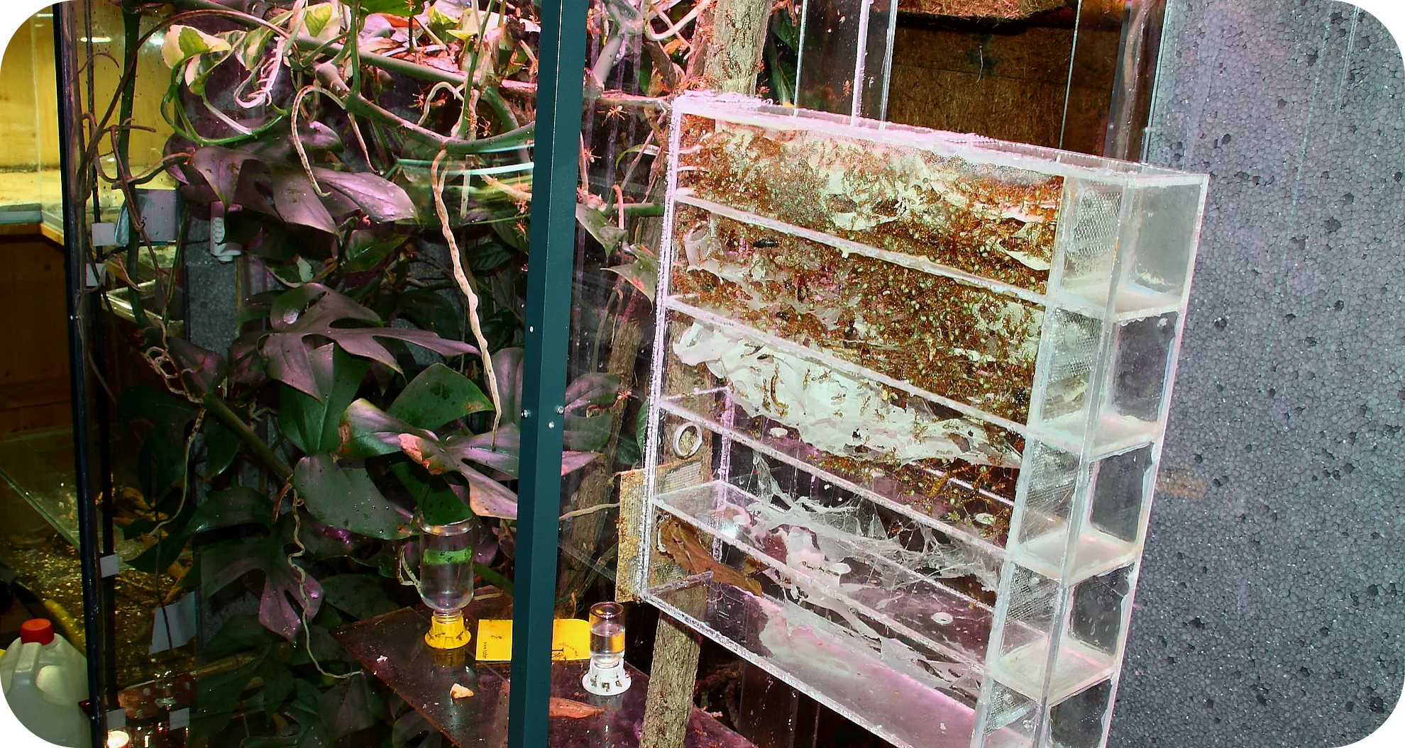 Gebaut, wie das Terrarium auch, mit Acrylglas.Die länglichen Kammern sind als Nestbereiche gedacht und, wie zu sehen, gut angenommen.Die hinteren kleineren Kammern sind die Wasserspeicher, sie sind nachfüllbar und durch eine Gaze von den Nestkammern getrennt.
