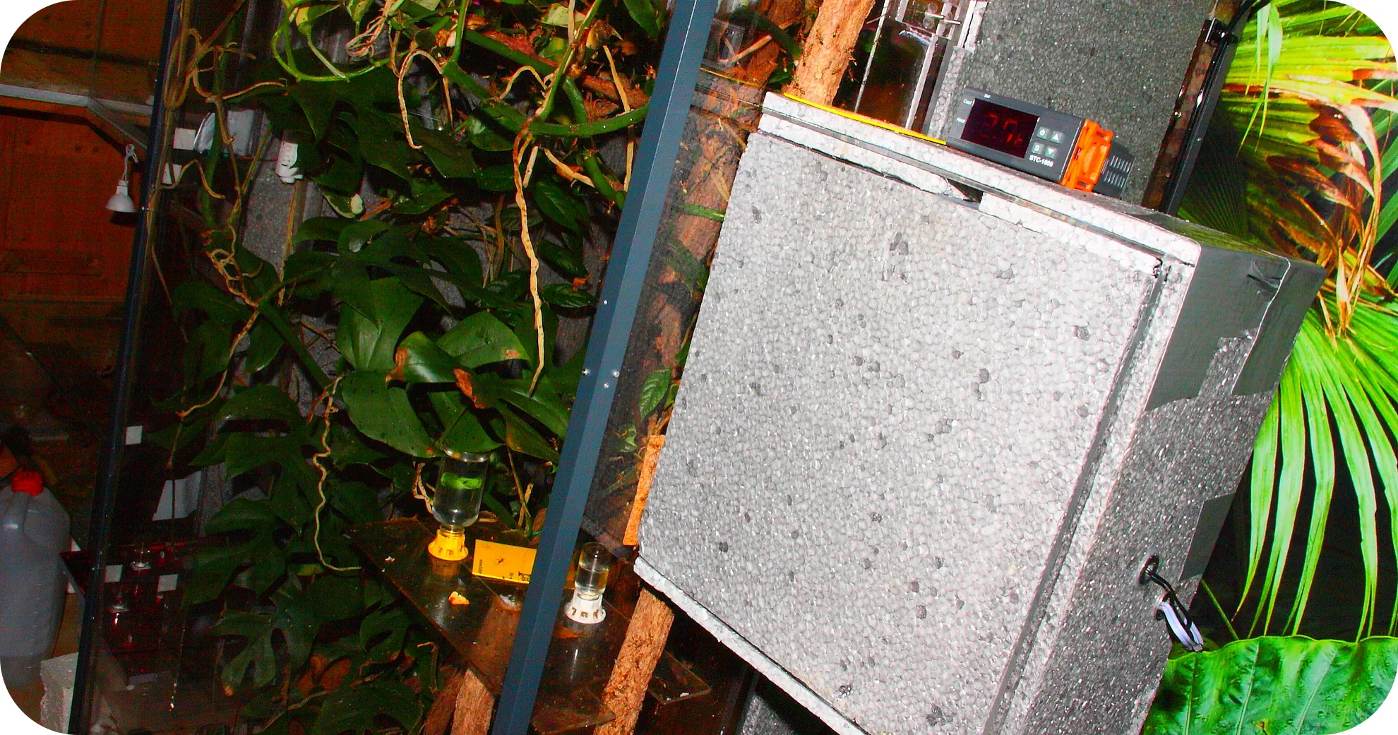 Oecophylla smaragdina brauchen es warm, in der Styroporbox ist eine geregelte Heizung integriert.Simpel aufgebaut, realisiert mit einer 12-Volt-Heizfolie.Dazu ein Temperatursensor und eine elektronische Regelung bzw. ein elektronisches Regelgerät.Der Sicherheit geschuldet, die 12-Volt-Spannungsversorgung, zudem lassen sich für diesen Spannungsbereich leicht elektronische Regelungen selbst bauen.