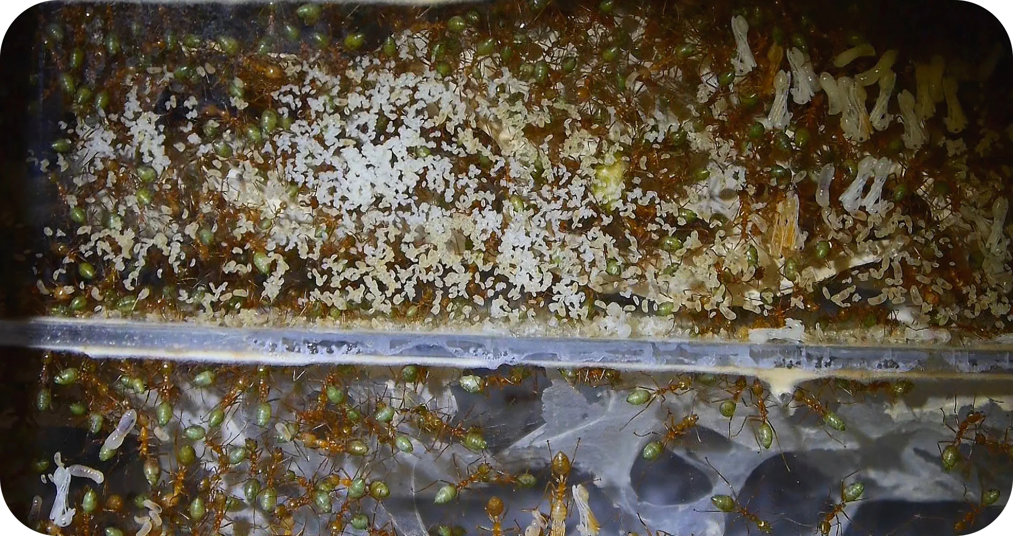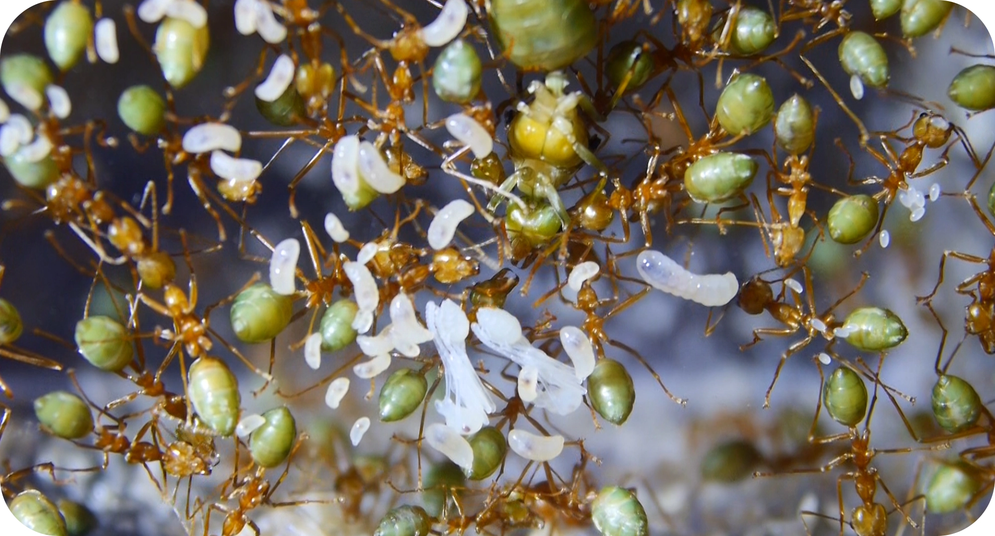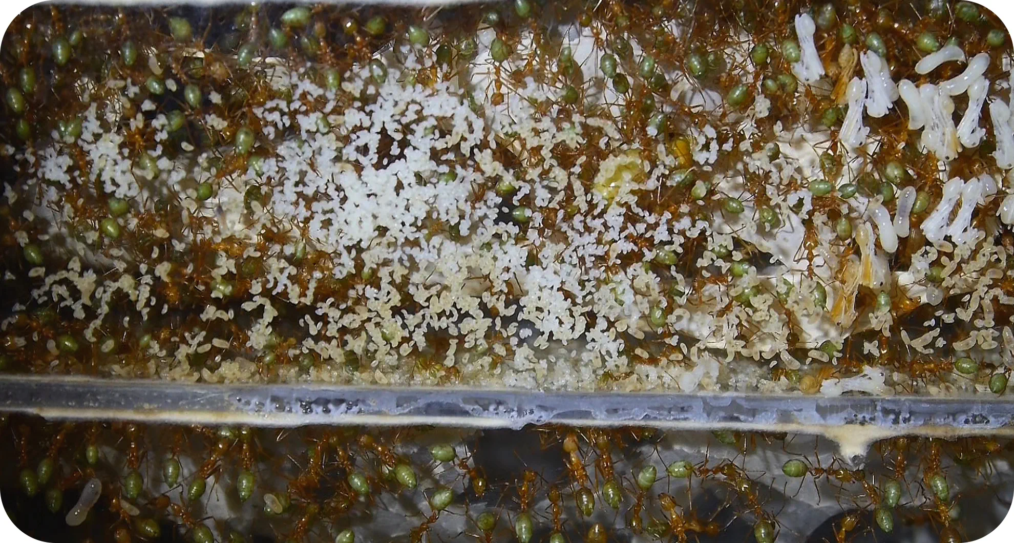 Mit den Beobachtungen von vor etwa einem Jahr komme ich zu der Überzeugung, dass Oecophylla smaragdina eine Ruhezeit einlegen. Die Larvenaufzucht wurde fast komplett eingestellt, nur noch wenige Larven werden bis zur Verpuppung aufgezogen.
