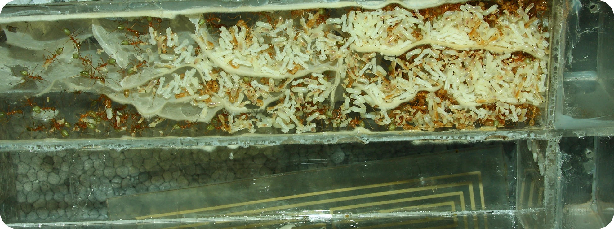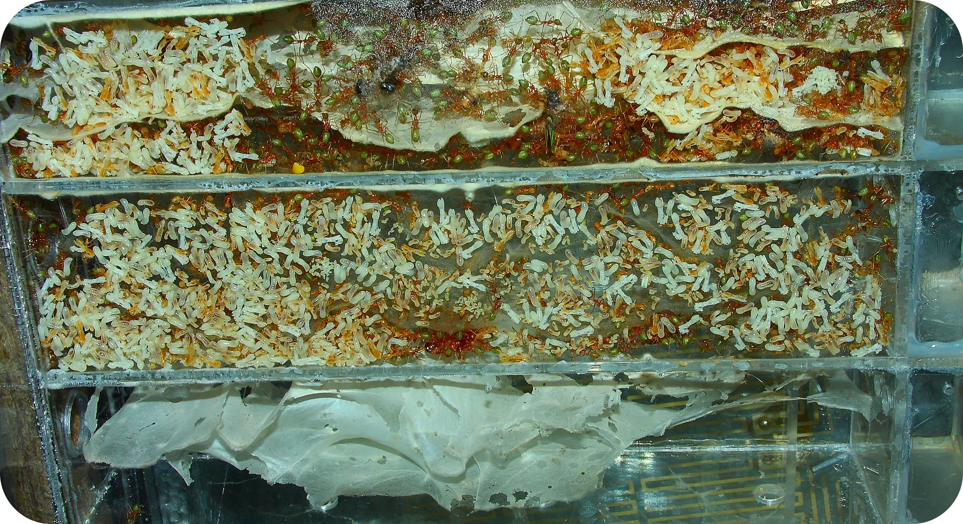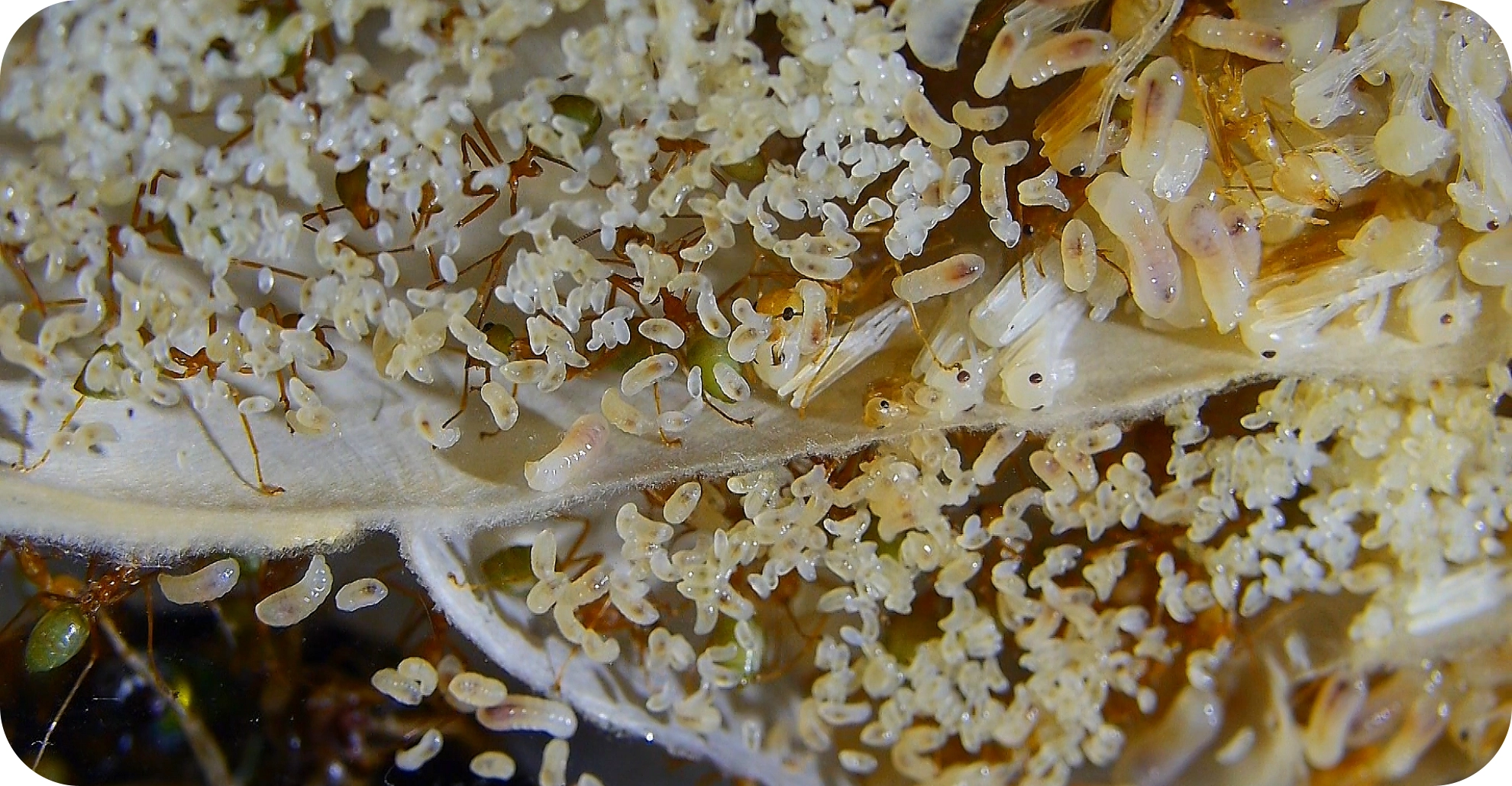 Mit den Beobachtungen von vor etwa einem Jahr komme ich zu der Überzeugung, dass Oecophylla smaragdina eine Ruhezeit einlegen. Die Larvenaufzucht wurde fast komplett eingestellt, nur noch wenige Larven werden bis zur Verpuppung aufgezogen.