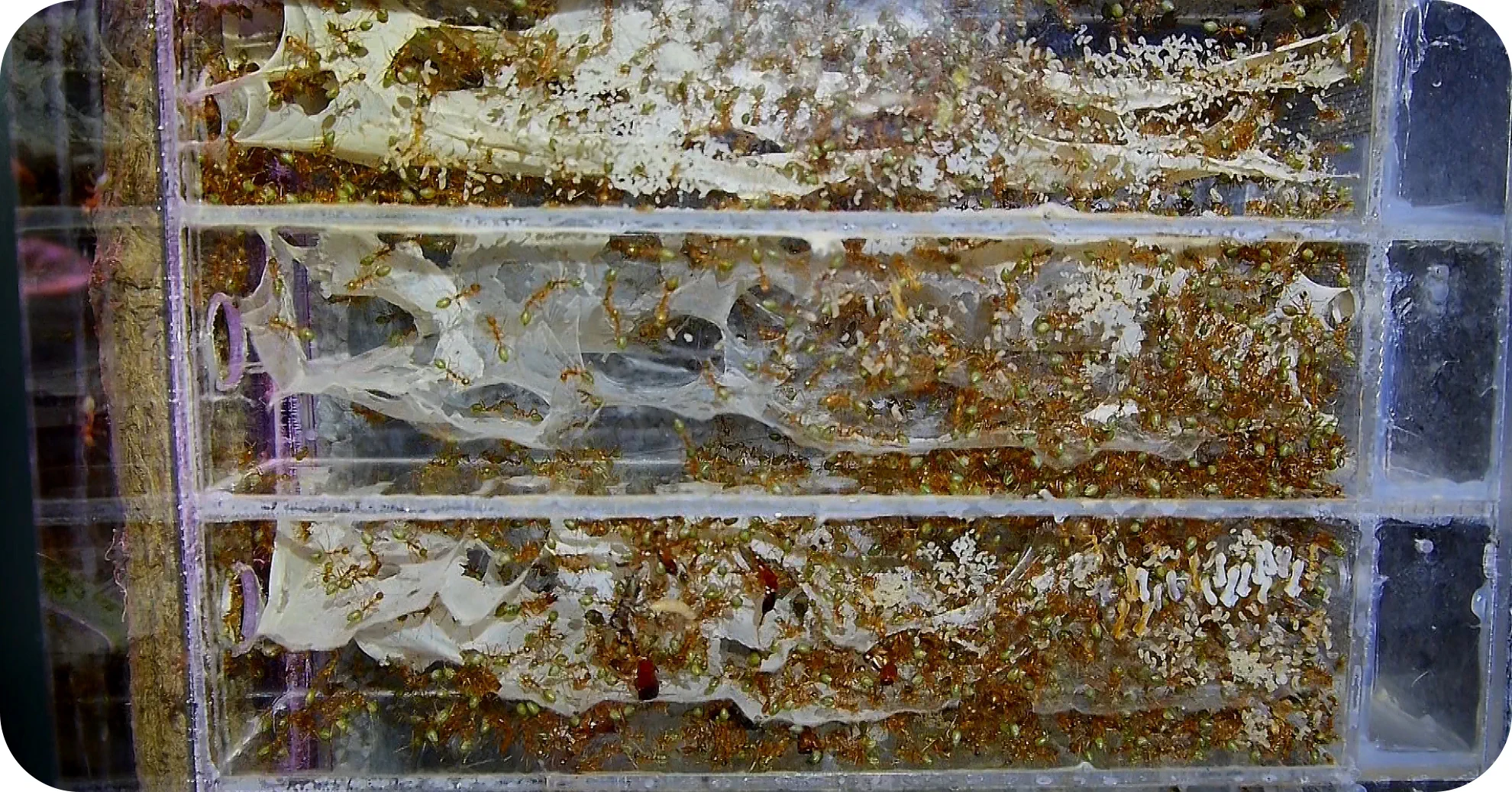 19. November 2025Es gefällt den Oecophylla smaragdina in dem künstlichen Kunststoffnest. Die Anzahl der Arbeiterinnen hat sich überdeutlich gesteigert, es sind jetzt mehr als je zuvor.Ihre Königin hat sich ein wenig verändert, ihr Gaster (Hinterleib) ist angeschwollen, und es haben sich deutlich sichtbare Dehnungsstreifen gebildet.