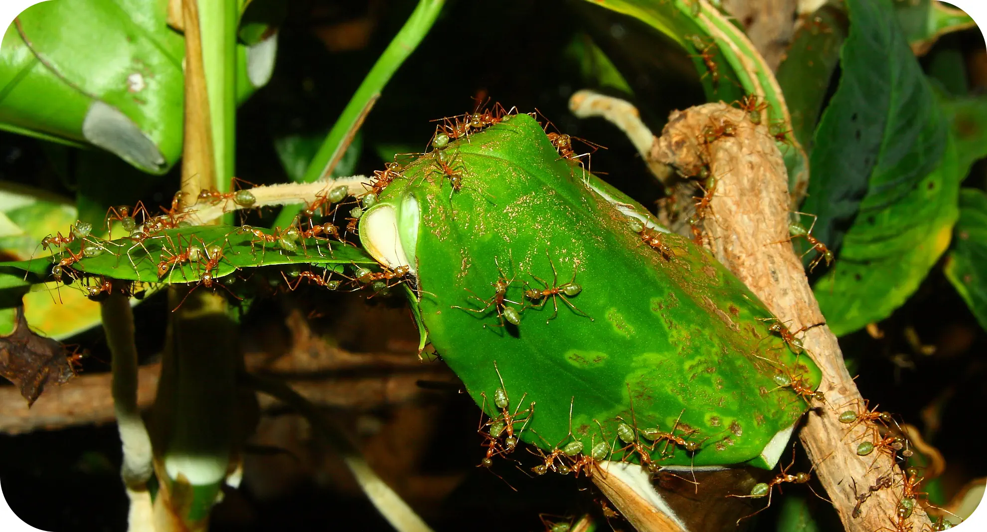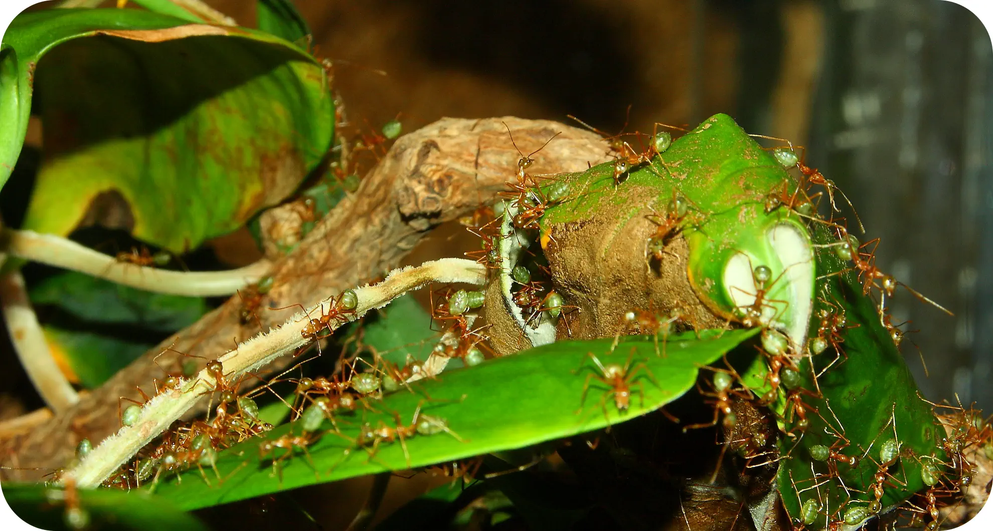Was ich immer wieder bewundere, es fallen keine Ameisen herunter. Erstaunlich, was ihre Tarsen an Haftkraft entwickeln, leider ergibt sich für mich als Halter daraus ein gravierender Nachteil.Diese Ameisen sind nicht sonderlich stubenrein, ihren Müll entsorgen sie prima, na ja ist auch nicht gerade sonderlich schwierig. Raus aus dem Nest und einfach fallen lassen, den Asseln freut das, die warten schon. Wie alle Ameisen müssen auch Oecophylla smaragdina kacken, kacken wo sie gerade sind, nur ihr Nest verschonen sie damit. Dann komme ich ins Spiel, zumindest an der vorderen Scheibe muss der Mist weg. Dass diese Ameisen überaus aggressiv reagieren, habe ich bereits geschrieben. Leider lässt es sich bei Reinigungsarbeiten nicht vermeiden, dass Finger und Arm an die Blätter ihres Nestes kommen, das bringt sie so richtig auf die Palme. In Massen strömen sie aus ihrem Nest und nicht selten mir in den Ärmel. Ärmellos hilft auch nicht, hatte ich auch schon geschrieben, diese Ameisen beißen. Mit der guten Haftkraft ihrer Beinsohlen und ihren sich festbeißenden Mandibeln sind sie nur schwer wieder loszuwerden.25.10.2025Ihr Domizil im Grünen hat etwa vier Wochen gehalten.
