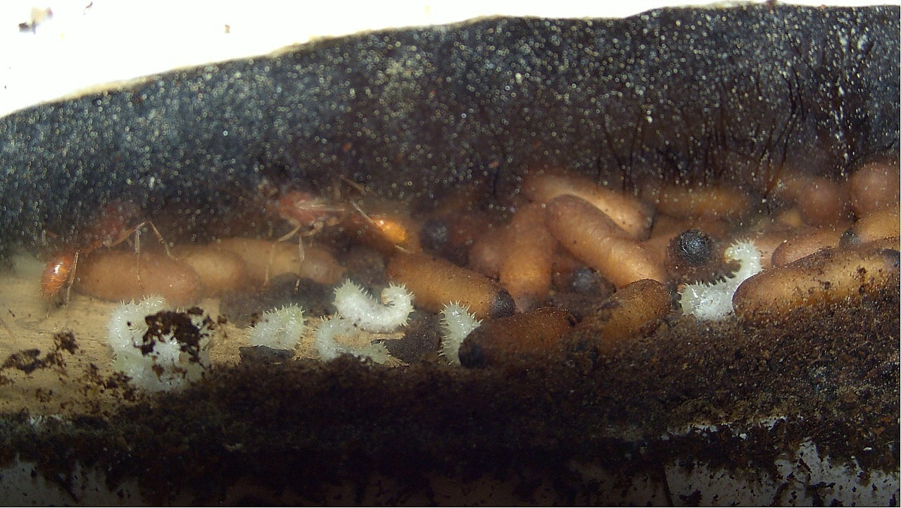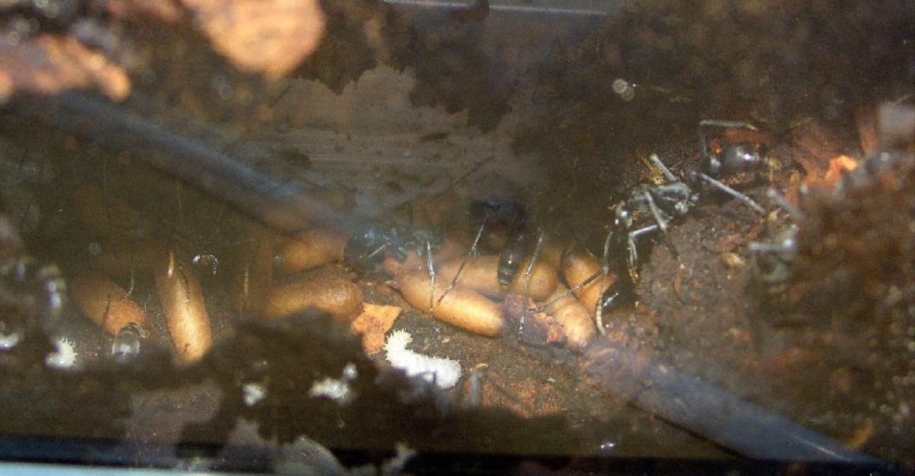 Neben Heimchen futtern Sie gerne Fliegen. Fliegenpuppen und die später daraus schlüpfenden Fliegen als lebenden Vorrat anzubieten,klappt bei diesen Ameisen nicht. Sie erkennen die Puppen als Beute und das war es dann mit dem Fliegenleben.In den letzten Tagen habe ich ihnen Mehlkäferpuppen angeboten, nehmen sie auch.Was sie bei mir nicht nehmen, sind abgebrühte Insekten, ob sich das ändert, wenn sie keine Lebenden bekommen, kläre ich noch.Mit überbrühten und zerkleinerten Fliegenmaden hatte ich einen geringen Erfolg.Die Futtergier blieb nicht ohne Folgen, zu meiner Freude unzählige Eier, schätzungsweise mehr als hundert.