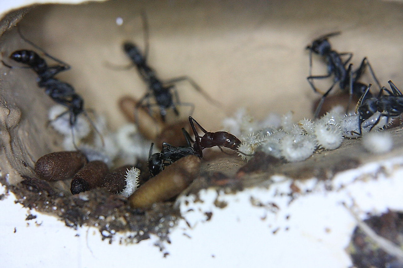 Nicht abzusehen, ob die Kolonie stirbt oder es nur der normale Akt der Vermehrung ist.Die letzten Puppen sind bald geschlüpft, Larven ziehen sie zurzeit keine mehr auf.Es gibt richtig viele Eier, die nicht schlüpfen